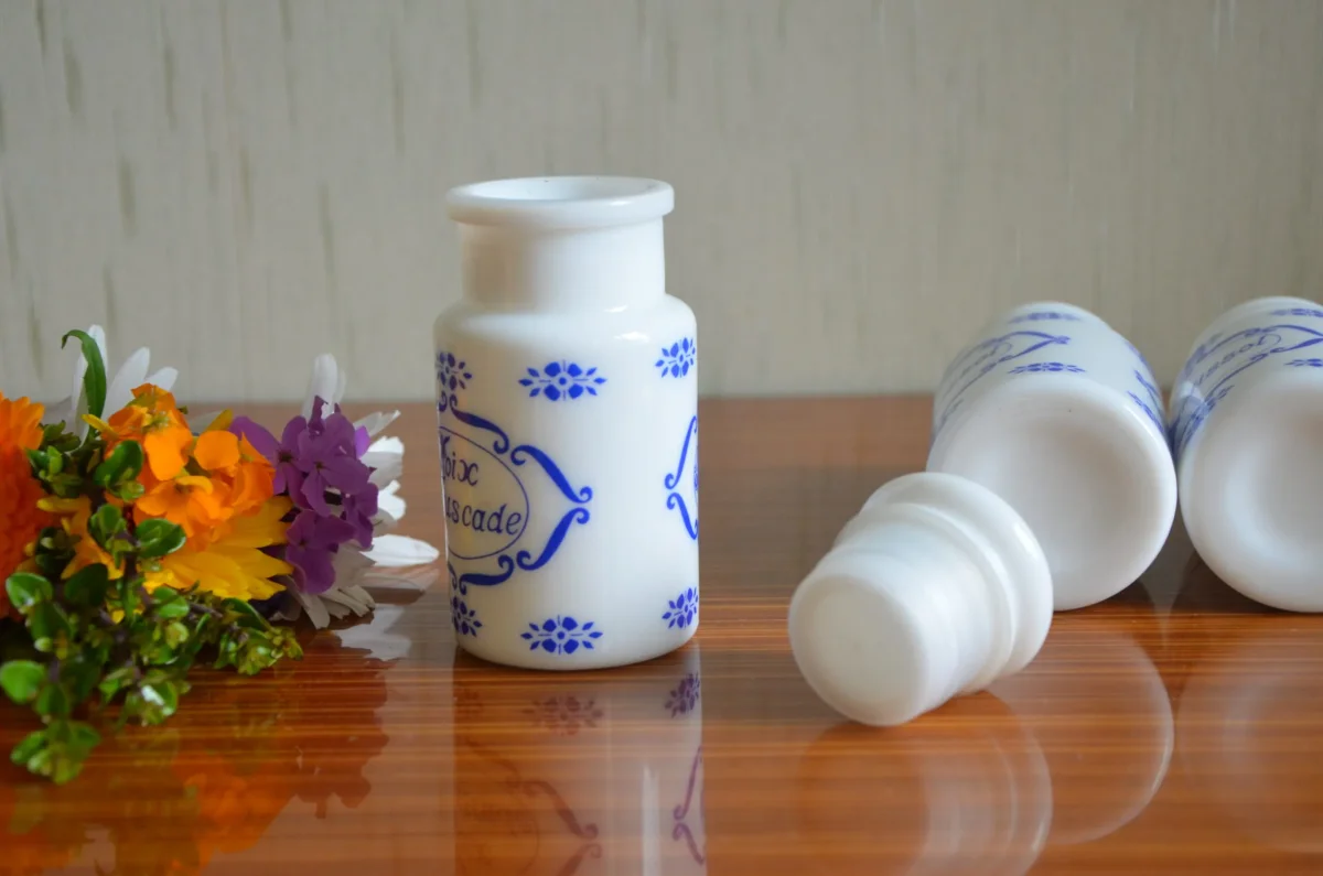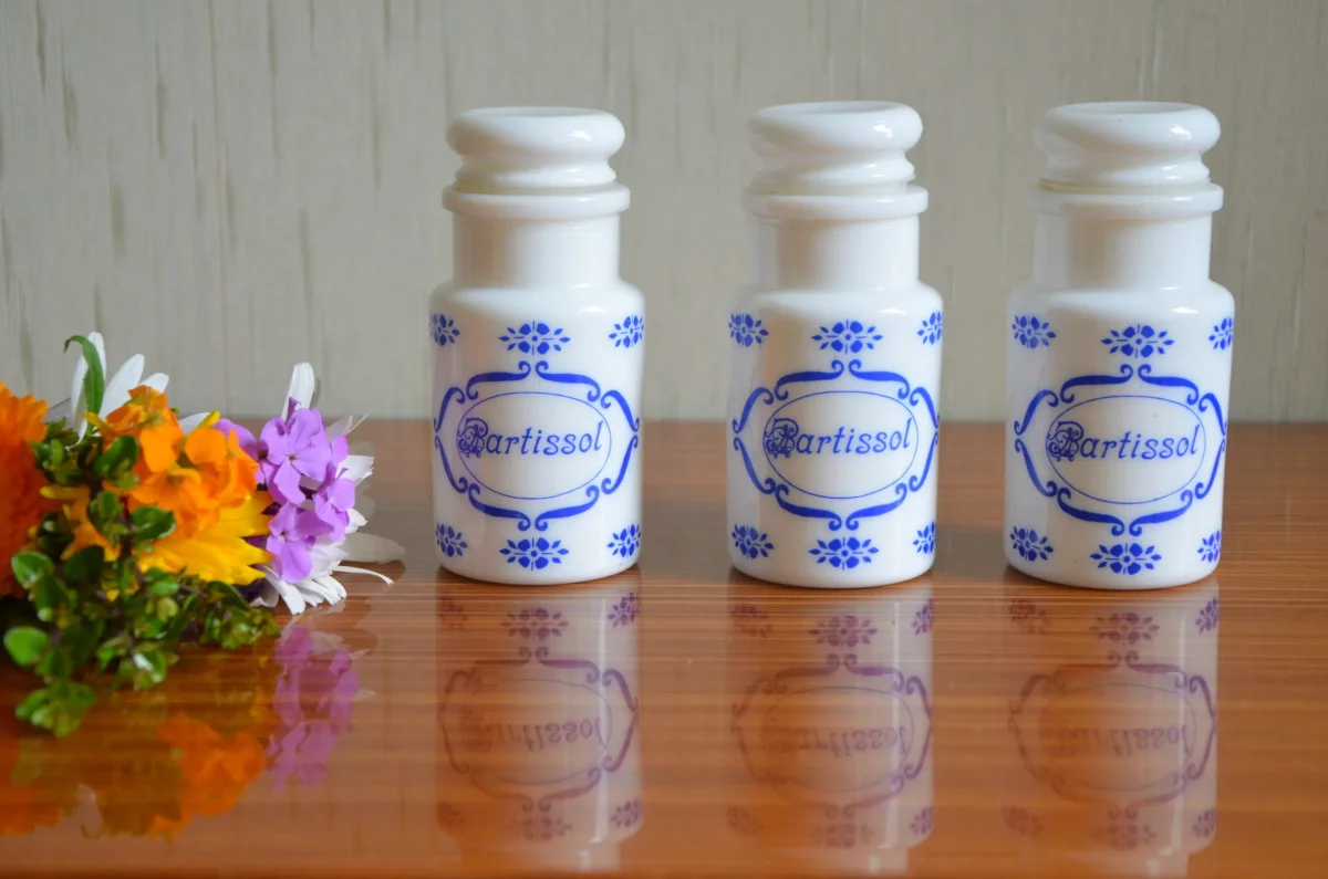 Lot de 3 pots à épice Bartissol (noix de muscade x2, cannelle) en opaline.