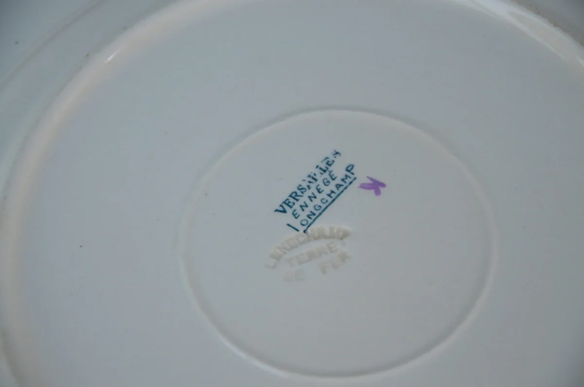Lot de 5 assiettes plates, manufacture de Longchamp modèle Versailles Ennegé, Terre de Fer. Modèle fabriqué entre 1912-1915.
