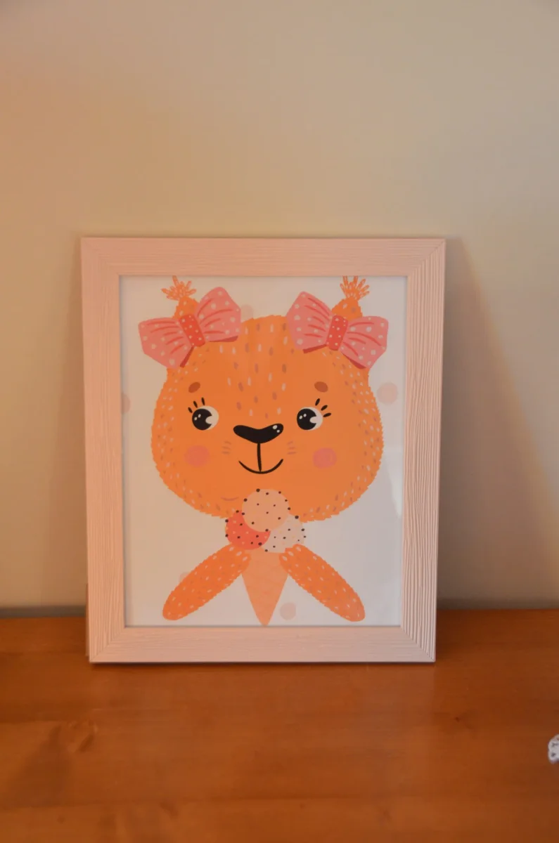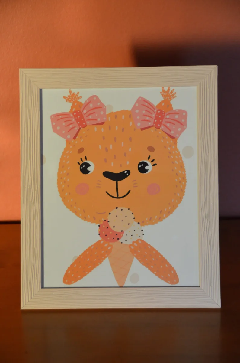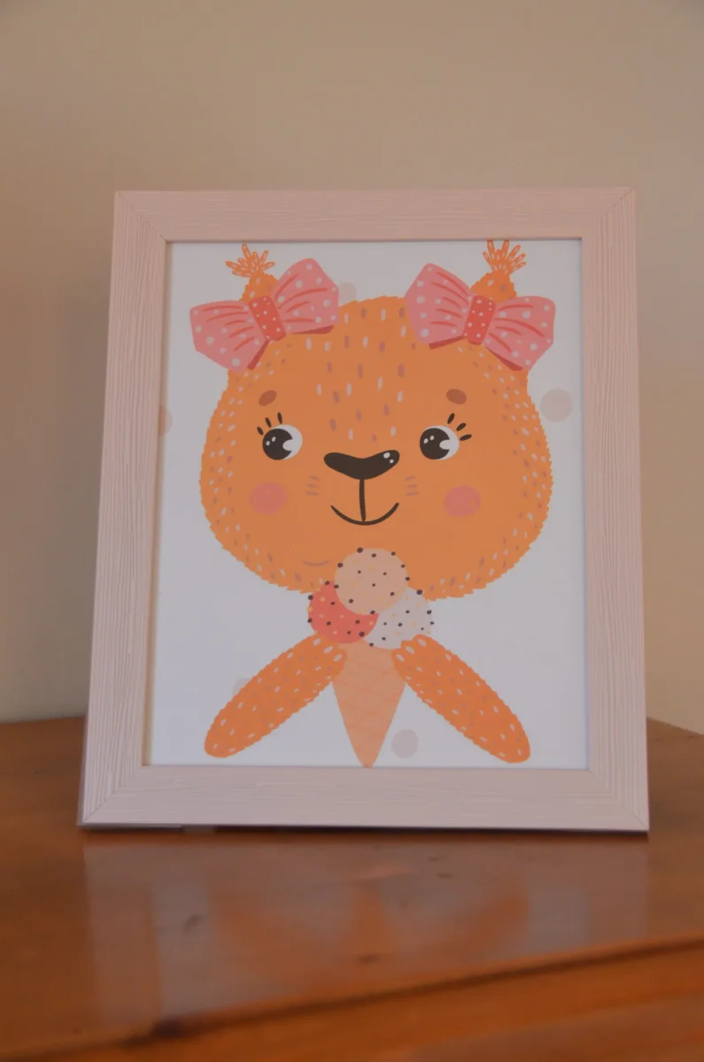 Affiche encadrée d’une petite oursonne mangeant une glace