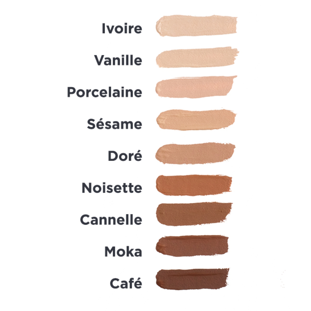 Eau d’hamamélis*, Eau, Oxyde de dioctyle, Polyglyceryl-2 dipolyhydroxystearate, Glycérol, Dicaprylyl carbonate, Ester triple de glycérol et des acides caprylique et caprique, Silice, Polyglyceryl-3 diisostearate (dérivé de glycérol et d’acide isostéarique), Glycérides de coco, Huile de ricin hydrogénée, Pentylène glycol, Esters de jojoba (mélange de cire et d’huile de jojoba hydrogénée), Amidon de riz*, Sulfate de magnésium, Cire de tournesol, Huile de graine de jojoba*, Hydroxyde d’aluminium, Tocophérol (Vitamine E), Sodium lauroyl glutamate, Alcool benzylique, Honokiol, L-Lysine (acide aminé), Triglycérol, Acacia decurrens flower cera (Acacia decurrens flower wax), Phytate de sodium (sel de sodium de l’acide phytique), Benzoate de sodium (sel de sodium l’acide benzoïque), Chlorure de magnésium, Sorbate de potassium, Huile de graine de tournesol, Alcool (ou éthanol), Peut contenir :, +/- :, Dioxyde de titane (Colorant), Trioxyde de fer, Oxyde de fer, Tétraoxyde de fer