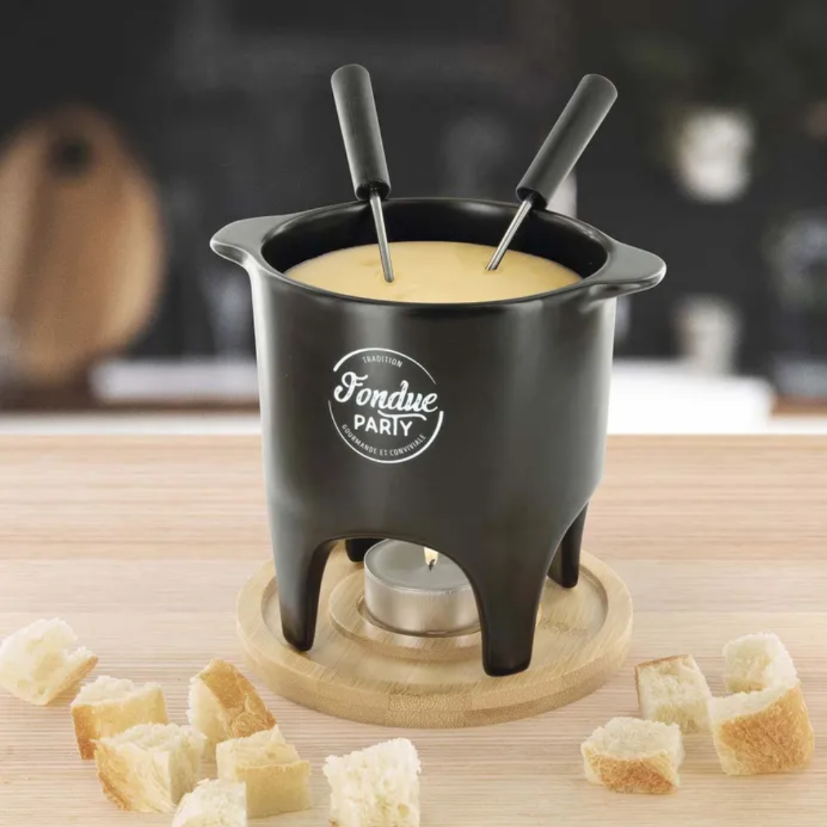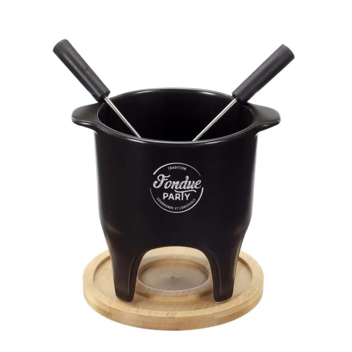Sa bougie chauffe-plat (non fournie) permet de faire fondre votre fromage ou votre chocolat sans électricité, offrant une expérience chaleureuse et nomade. Le service inclut 2 piques pour savourer facilement vos morceaux de pain ou fruits.