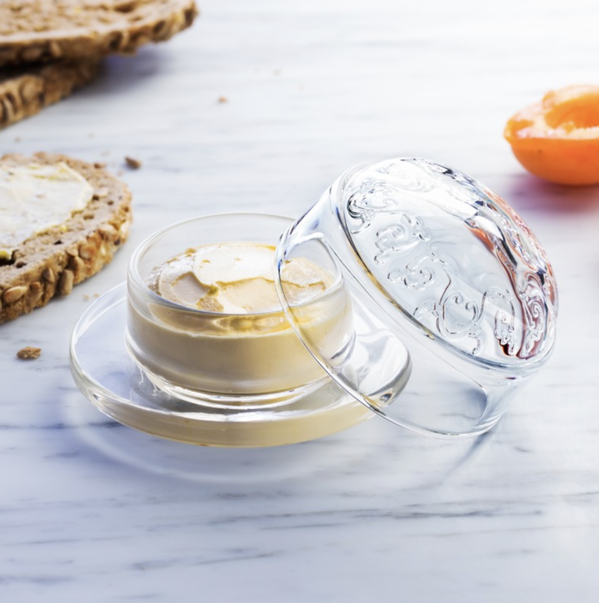 ÉLÉGANCE : Ce beurrier/confiturier en verre est tout à fait élégant. Ses lignes sont douces et on aime voir à l’intérieur le beurre frais ou la belle couleur de la confiture.