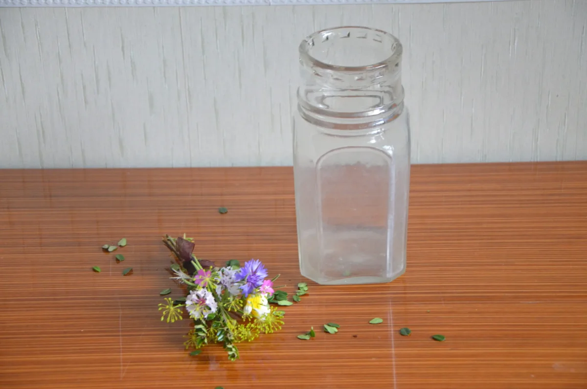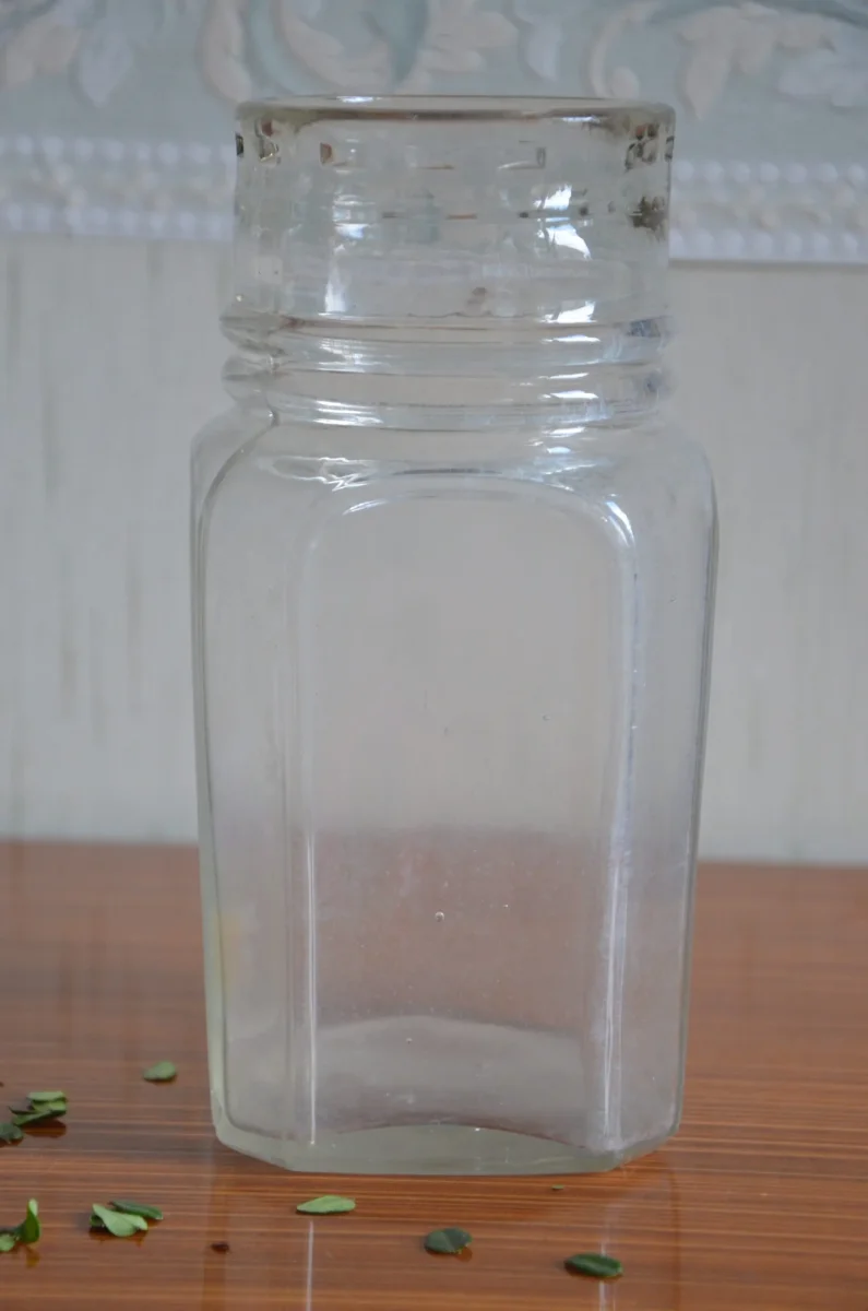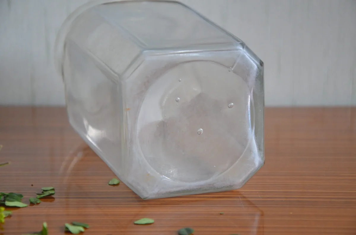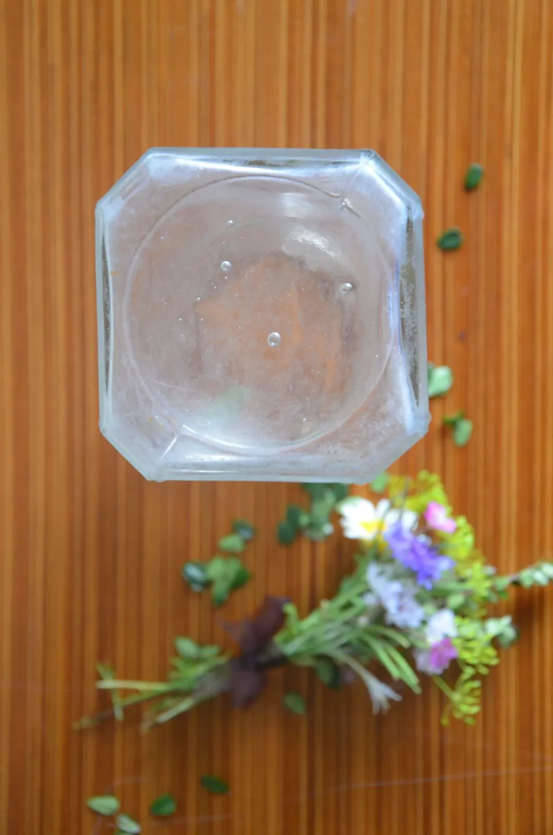 Bocal en verre ancien (présence de bulle). Verre octogonale blanchi.