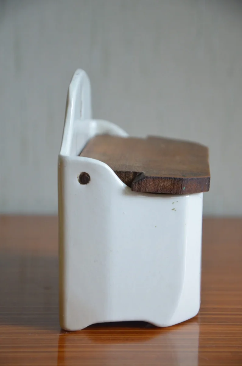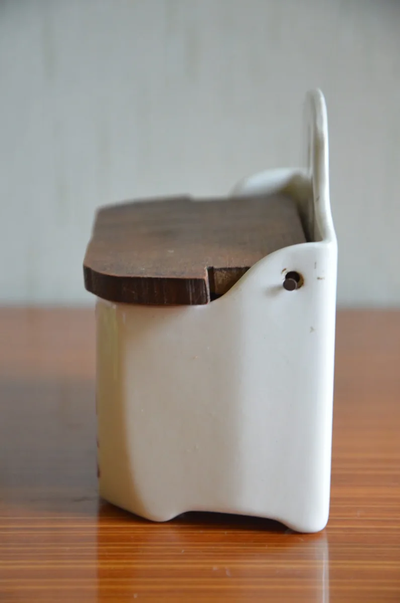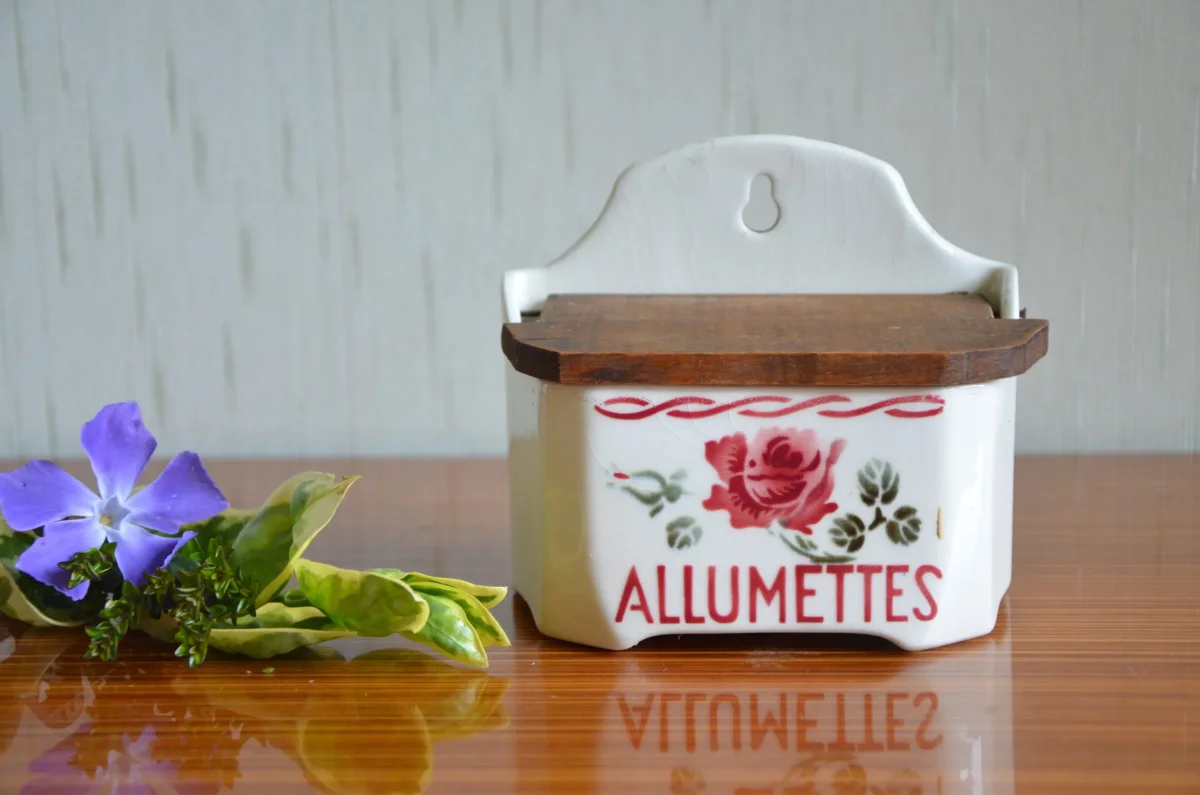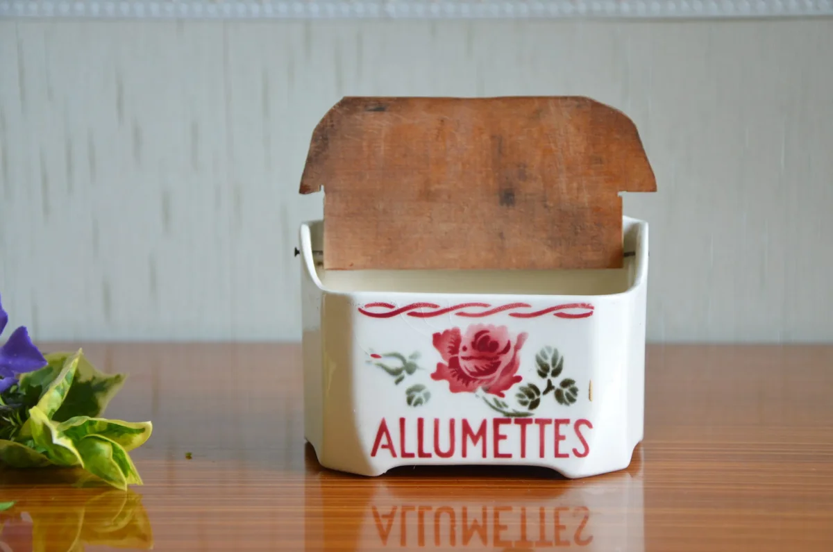 Pot mural à allumettes en demi-porcelaine, couvercle en bois, fabriqué par la manufacture Badonviller. Il est en parfait état. Je possède le pot à sel de la même collection (voir photo).
