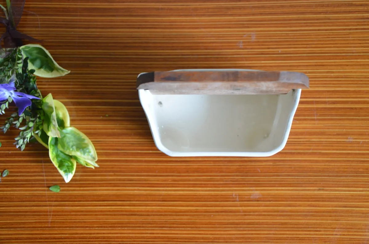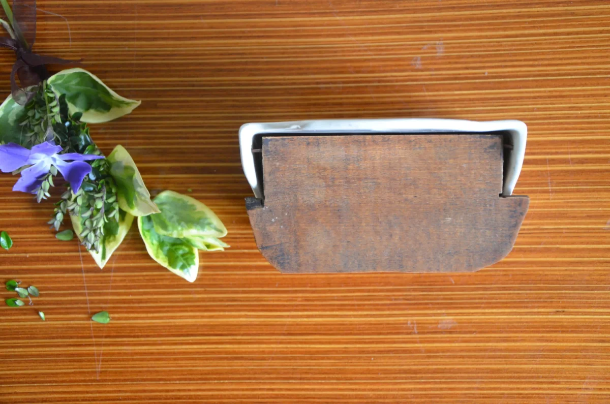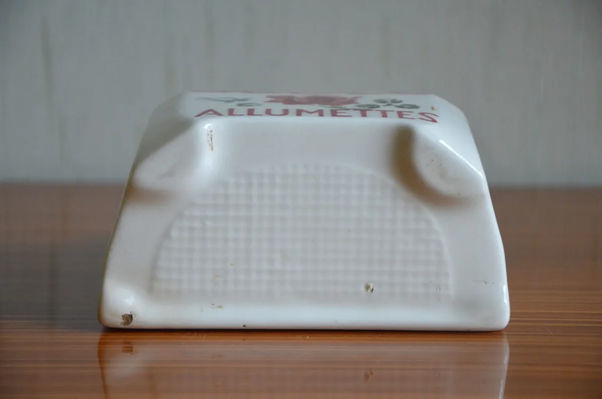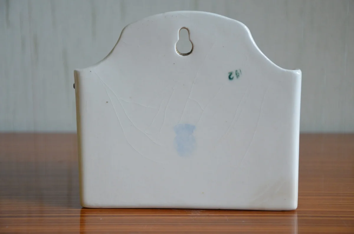Pot mural à allumettes en demi-porcelaine, couvercle en bois, fabriqué par la manufacture Badonviller. Il est en parfait état. Je possède le pot à sel de la même collection (voir photo).