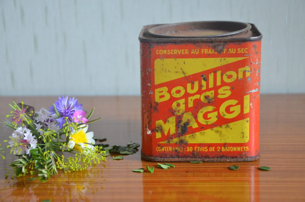 Boite en métal vintage, bouillon gras Maggi. Couleur rouge et jaune. Elle est très rouillée!