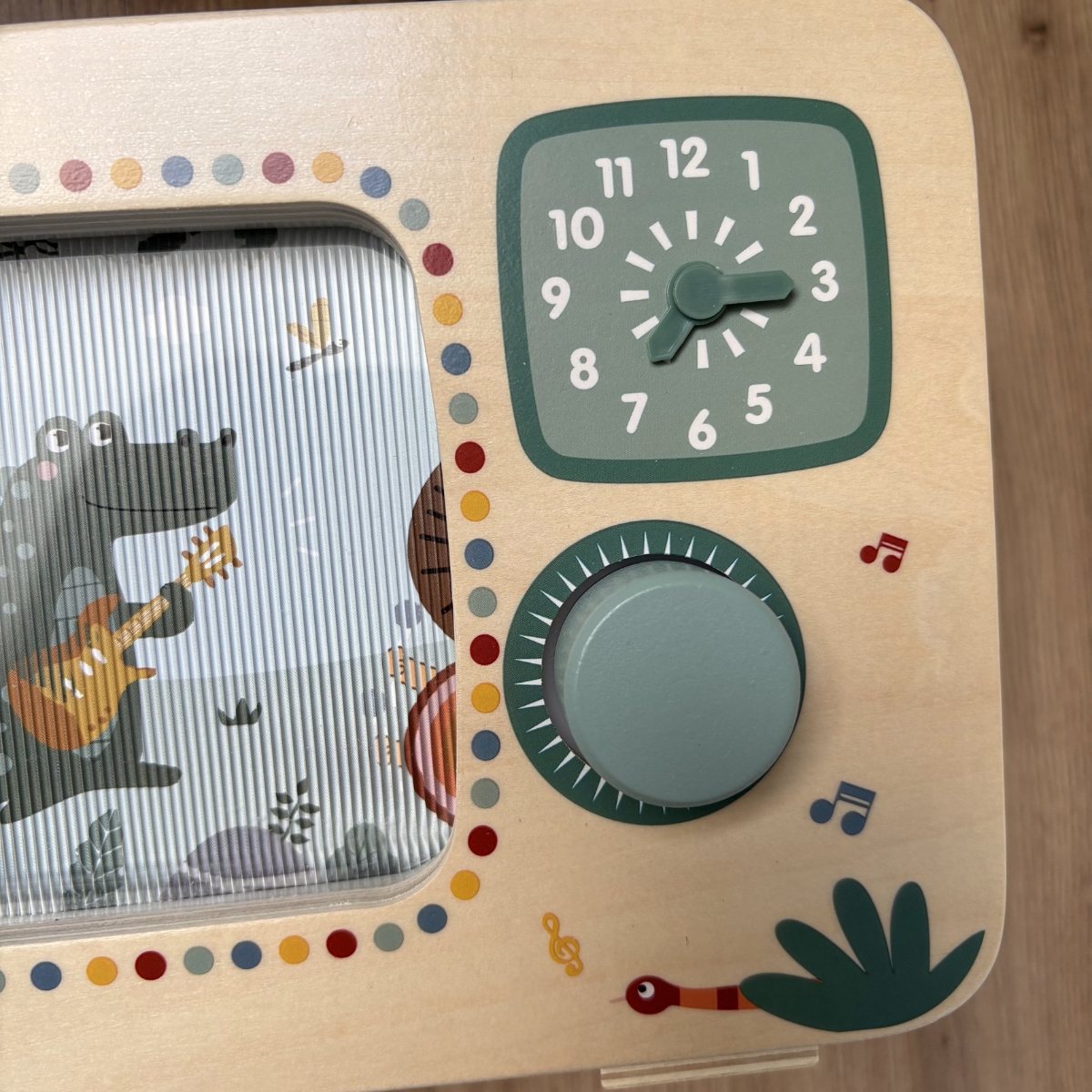 Son design original en forme de télévision fait apparaître un orchestre d’animaux de la savane en mouvement, qui s’anime au rythme de la mélodie. Il suffit de tourner le bouton pour voir l’image défiler et écouter la musique — un spectacle fascinant pour les petits.