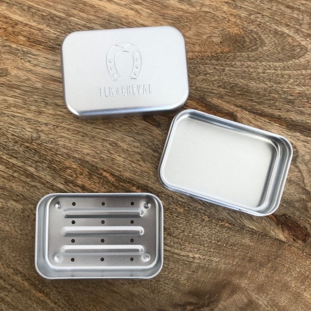 2 en 1 la boîte à savon Fer à Cheval en aluminium fera office de porte-savon et elle facilitera le transport de vos savonnettes 100g et 125g. Très légère, cette boîte à savon pourra vous accompagner dans tous vos déplacements. L’égouttoir présent au fond de la boîte vous permettra d’évacuer le trop plein d’eau. Votre savon séchera ainsi beaucoup plus vite. La boîte à savon est composée de trois éléments détachables : le couvercle, l’égouttoir et le fond.