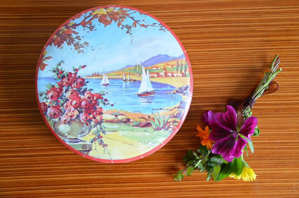 Boite ronde vintage en métal. Motif de bateau dans un port et rosier en premier plan.