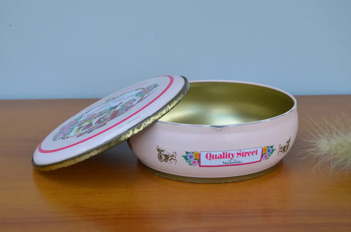 Boite ronde en métal Quality Street. Elle est rose et sur le couvercle on peut voir des personnages habillés à la mode du 19ème siècle. La date de péremption est juin 1987.