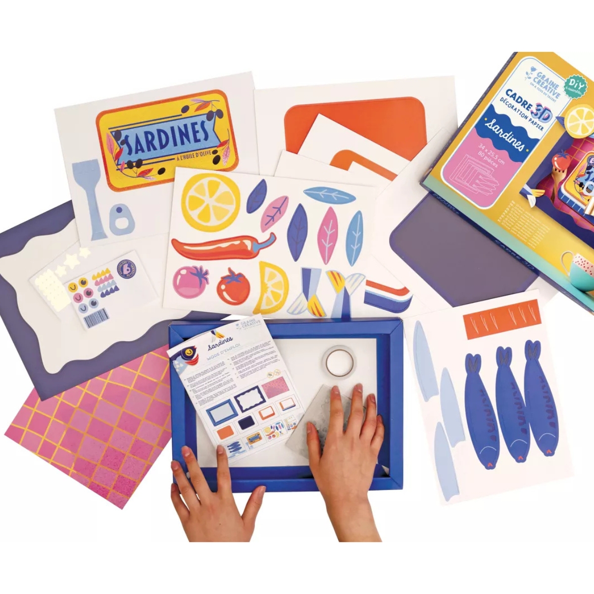 Kit créatif 100 % papier pour réaliser un décor 3D original autour d’une boîte de sardines, sans colle ni ciseaux, prêt à exposer en cadre décoratif.