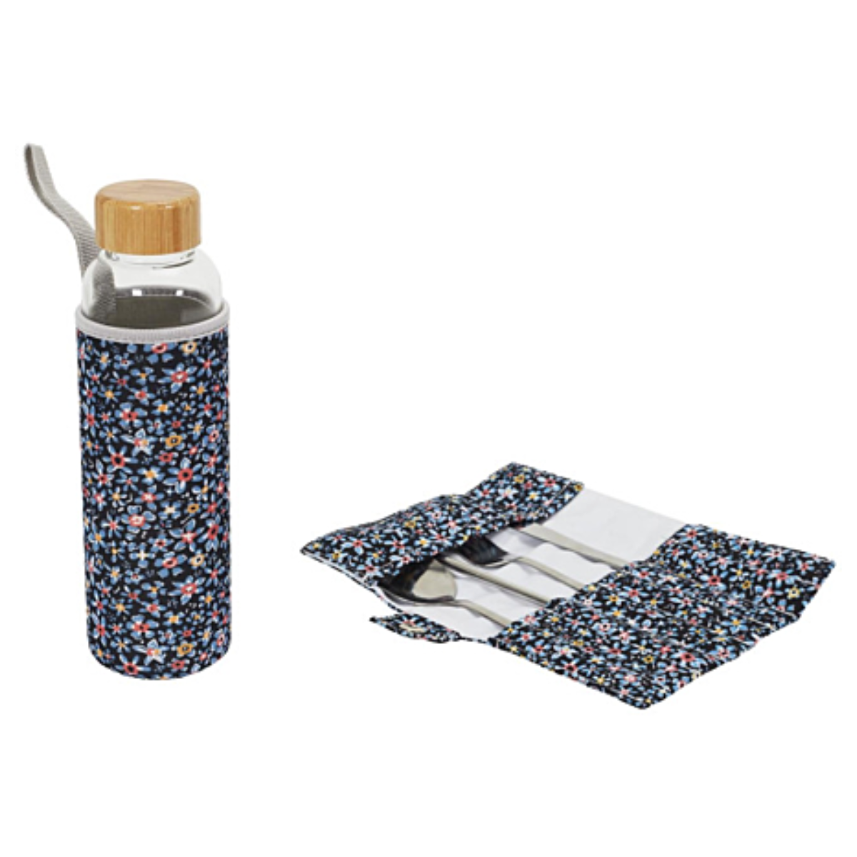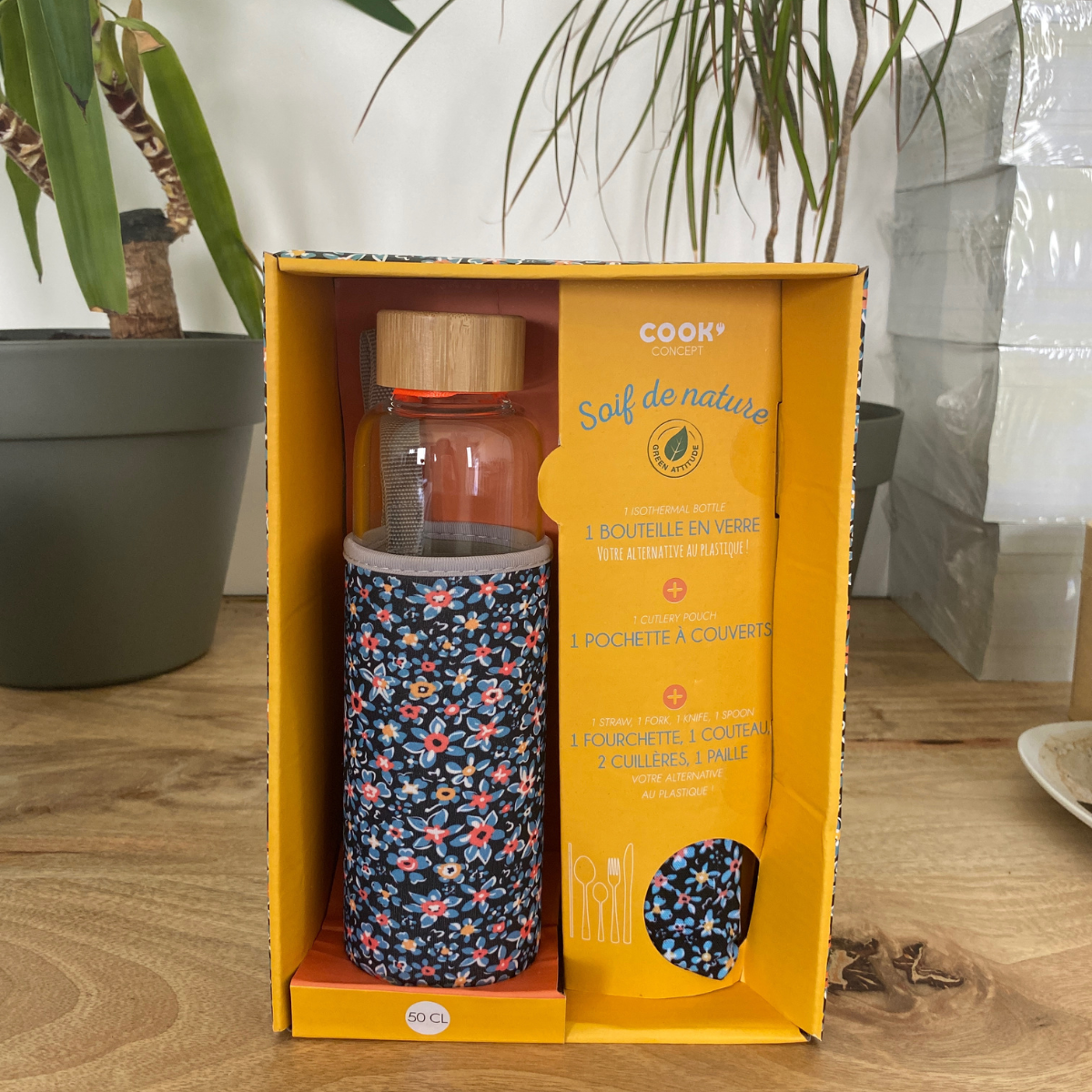 Adoptez une alternative écoresponsable avec cette bouteille en verre habillée d’une jolie housse fleurie. Idéale pour le quotidien, elle allie style et respect de l’environnement. Elle est présentée dans un coffret pratique comprenant : Une pochette à couverts en tissu Une fourchette, un couteau, deux cuillères Une paille réutilisable Parfait pour les repas nomades, ce kit complet vous aide à réduire l’usage du plastique tout en gardant une touche élégante et pratique dans vos déplacements.