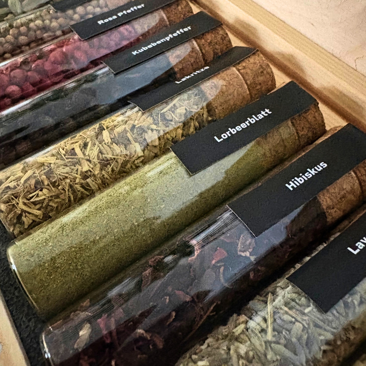 - 12 tubes en verre d’épices et ingrédients pour gin