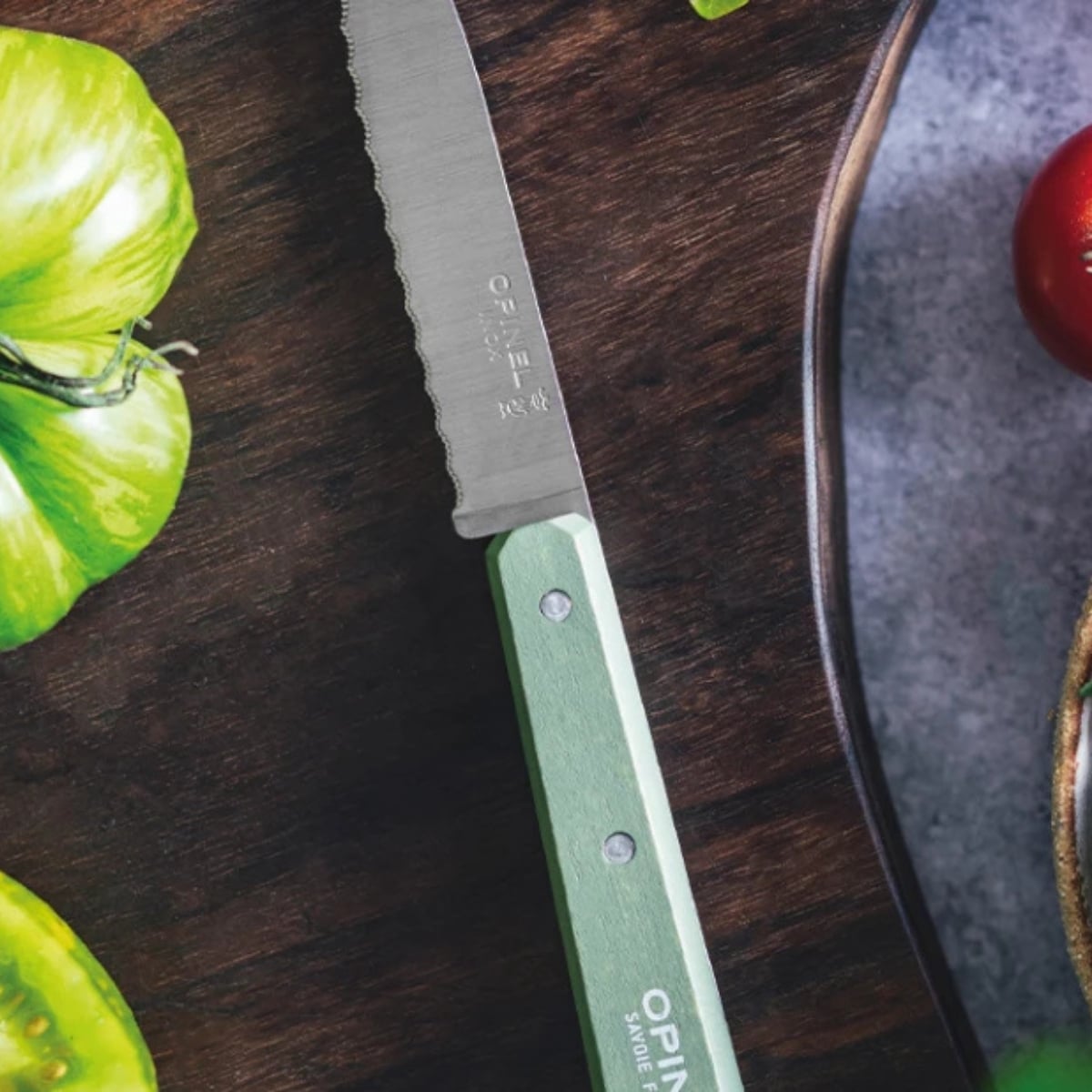 Précis et efficace, le couteau d’office cranté OPINEL n°113 est l’outil indispensable pour une découpe nette et sans effort. Sa lame microdentée en acier inoxydable de 10 cm assure une coupe impeccable des tomates, légumes et œufs durs, même les plus délicats. Son manche en bois de charme certifié PEFC, teinté d’une douce couleur sauge, s’inspire de paysages lointains. Conçu pour allier esthétisme et performance, ce couteau fabriqué en France vous garantit confort et durabilité au quotidien.
