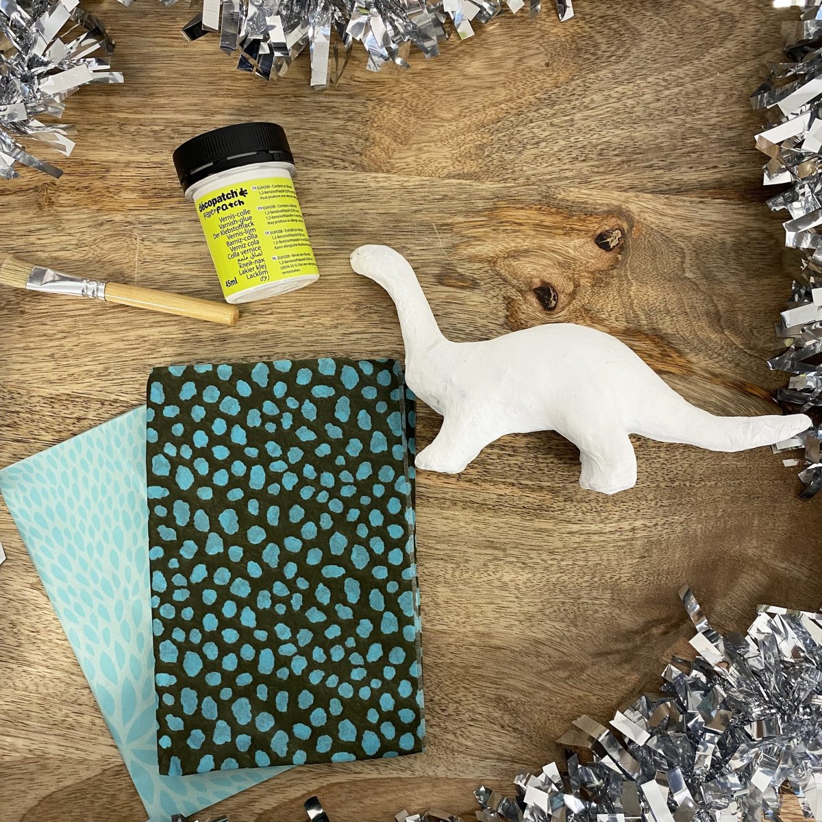Kit dinosaure en papier mâché à customiser avec la technique du décopatch.