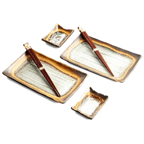 Pensé pour célébrer l’art de la table japonais dans toute sa simplicité maîtrisée, cet ensemble pour deux convives conjugue équilibre, fonctionnalité et élégance. Il se compose de deux assiettes rectangulaires aux lignes épurées, de deux coupelles assorties et de deux paires de baguettes, invitant à une dégustation à la fois authentique et raffinée.