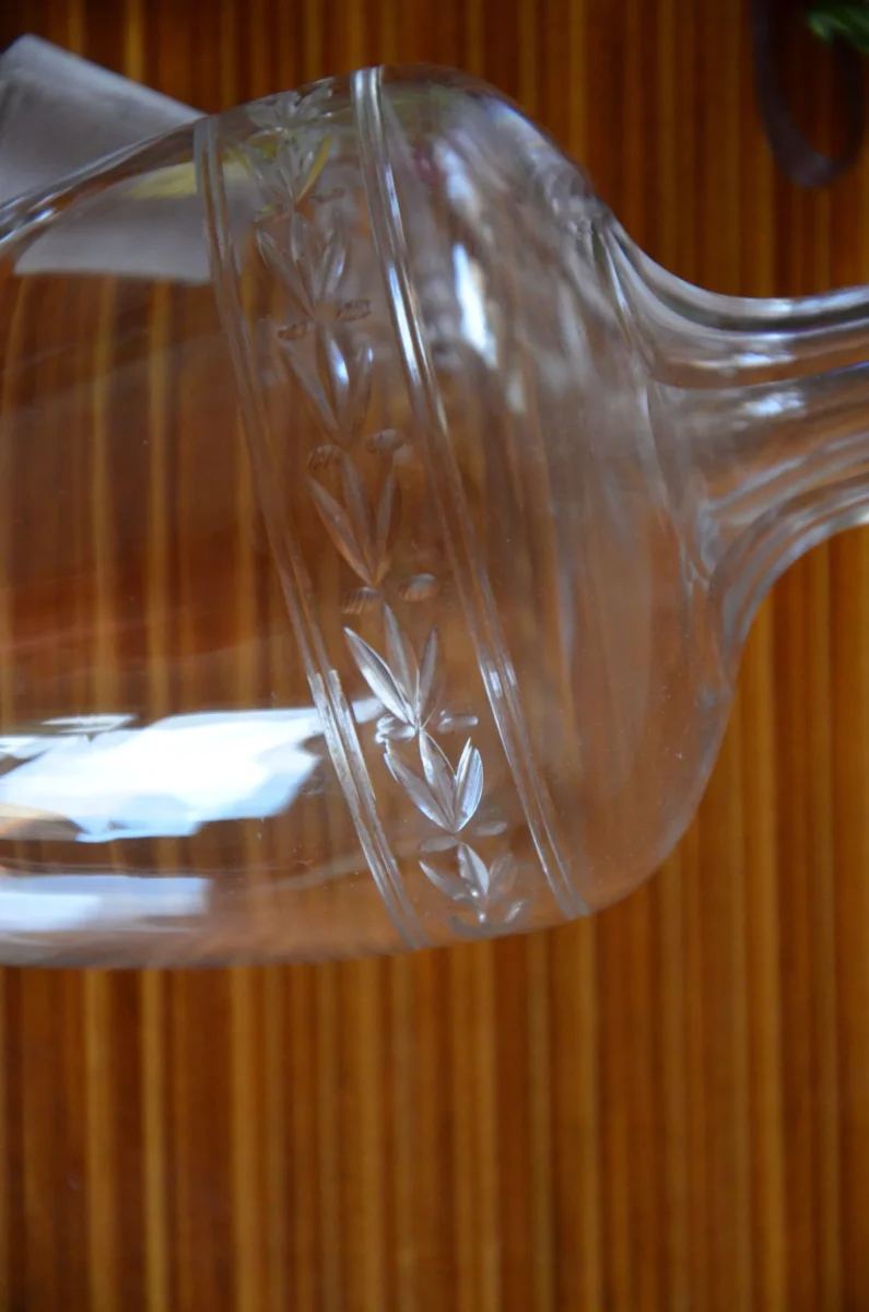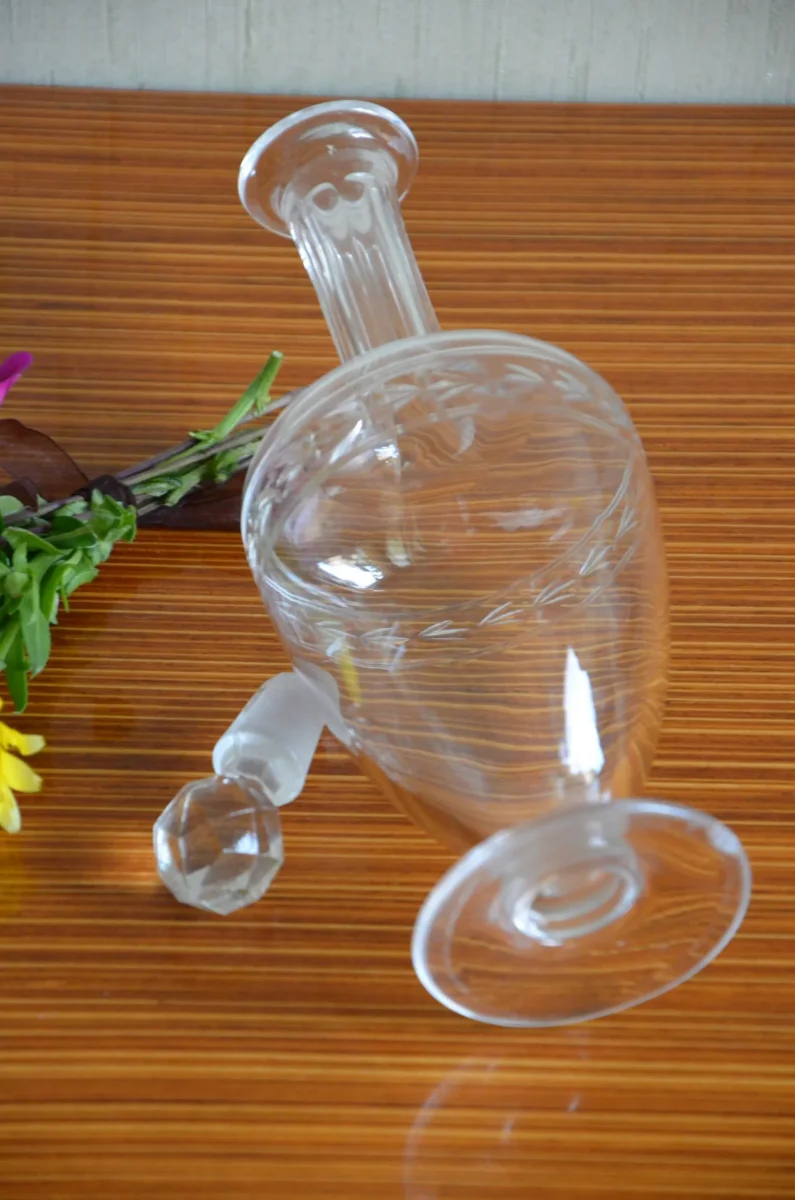 Fiole en verre sur pied gravé à la main, ciselé avec un long col. Bouchon cabochon taillé en diamant. A noter: il y a un éclat sur le pied!