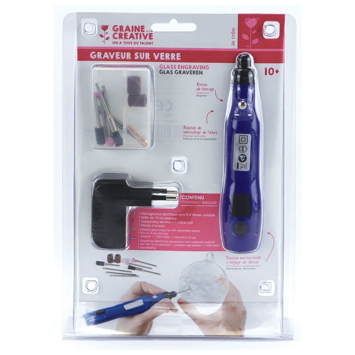 Le graveur sur verre et ses 10 embouts de la marque Graine Créative vous permettront de personnaliser vos objets en verre et créer de superbes décorations. Il est idéal pour débuter la gravure sur verre, vous permettant d’imaginer et de graver tous les motifs que vous souhaitez.