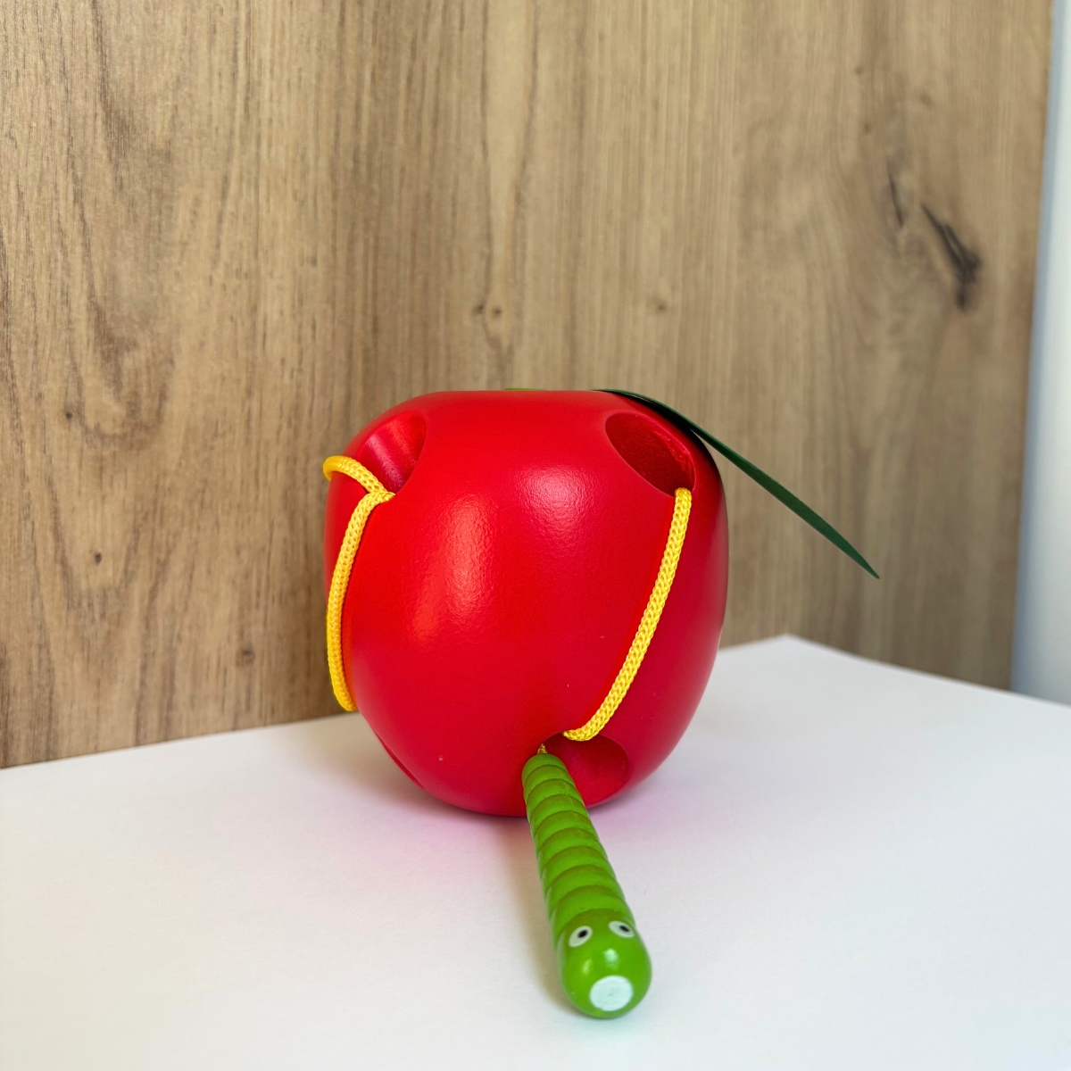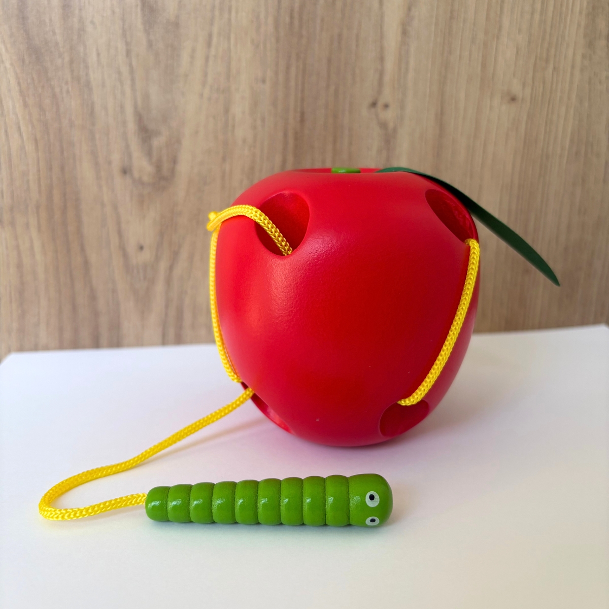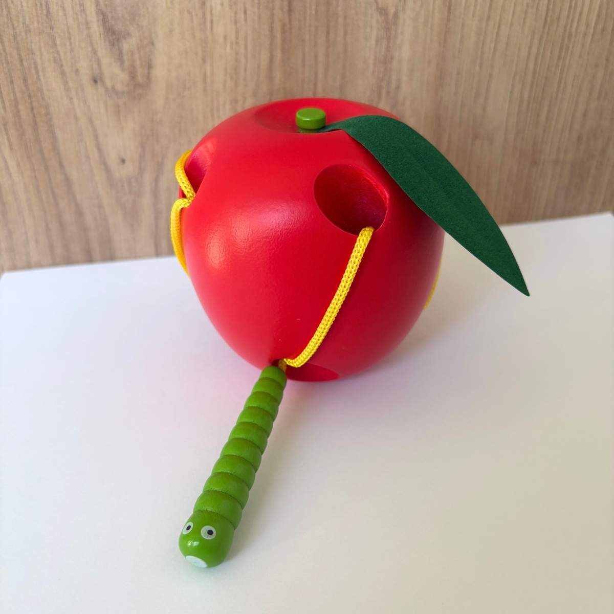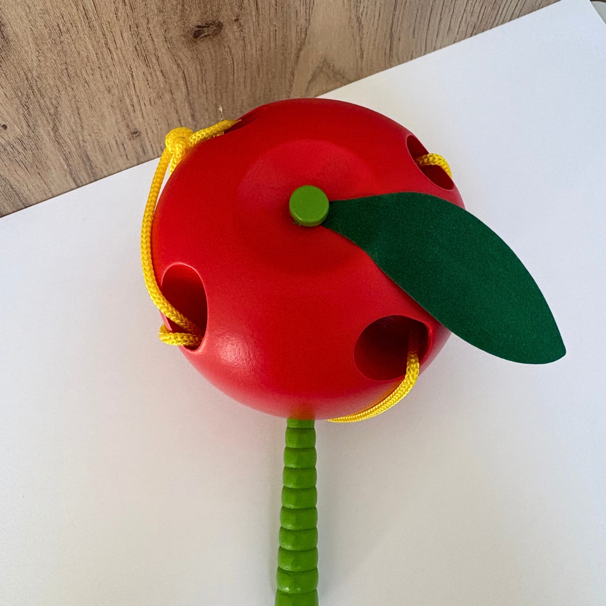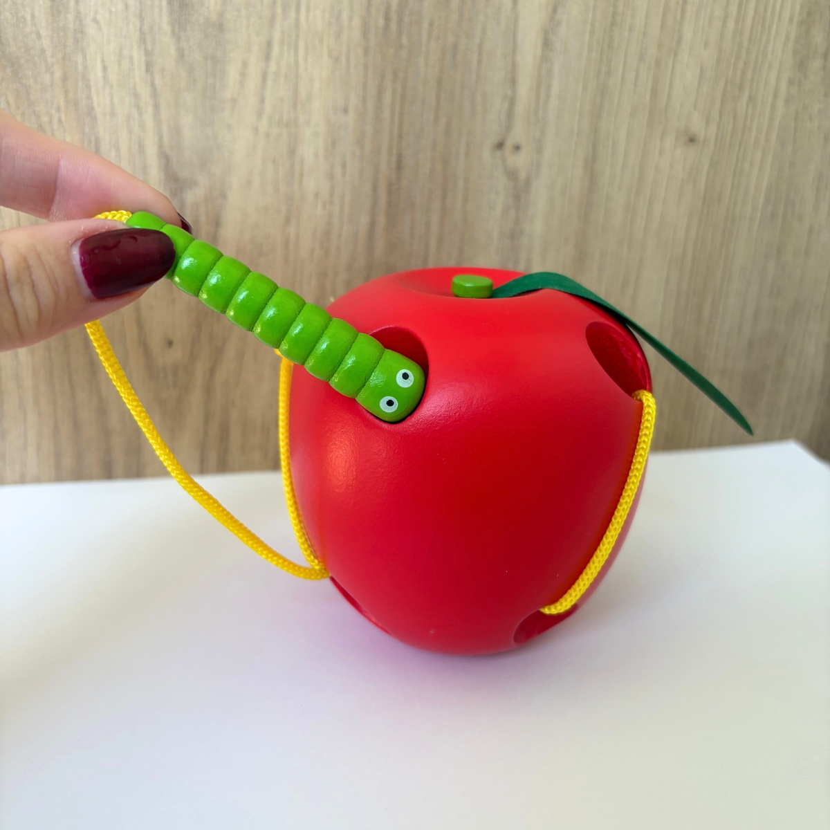 Un jeu d’apprentissage ludique pour les tout petits : Le ver en bois, attaché à une corde jaune va devoir se frayer un chemin entre les trous de la pomme !