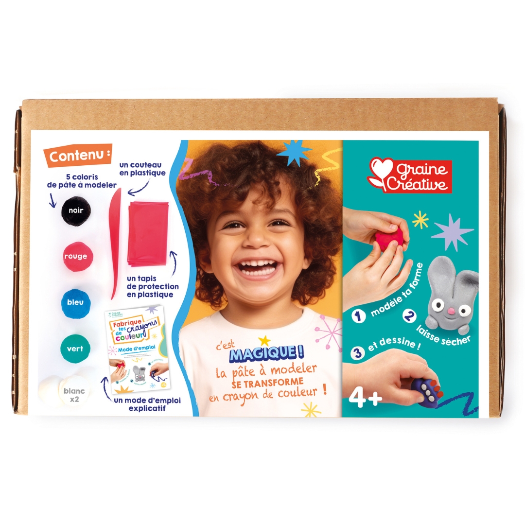 Fabrique tes propres crayons de couleurs grâce à la pâte à colorier ! Une fois modelée à la forme souhaitée et séchée, elle se transforme en crayon à colorier, trop marrant non ? Que contient mon Kit : Fabrique tes crayons de couleur ? Une planche de travail souple en plastique lavable Un petit couteau pour sculpter les formes 6 paquets de pâtes à modeler de 6 couleurs différentes (rouge, bleu, vert, jaune, blanc et noir) 1 mode d’emploi Caractéristiques : Ne convient pas aux enfants de moins de 36 mois. Petits éléments. Danger d’étouffement.