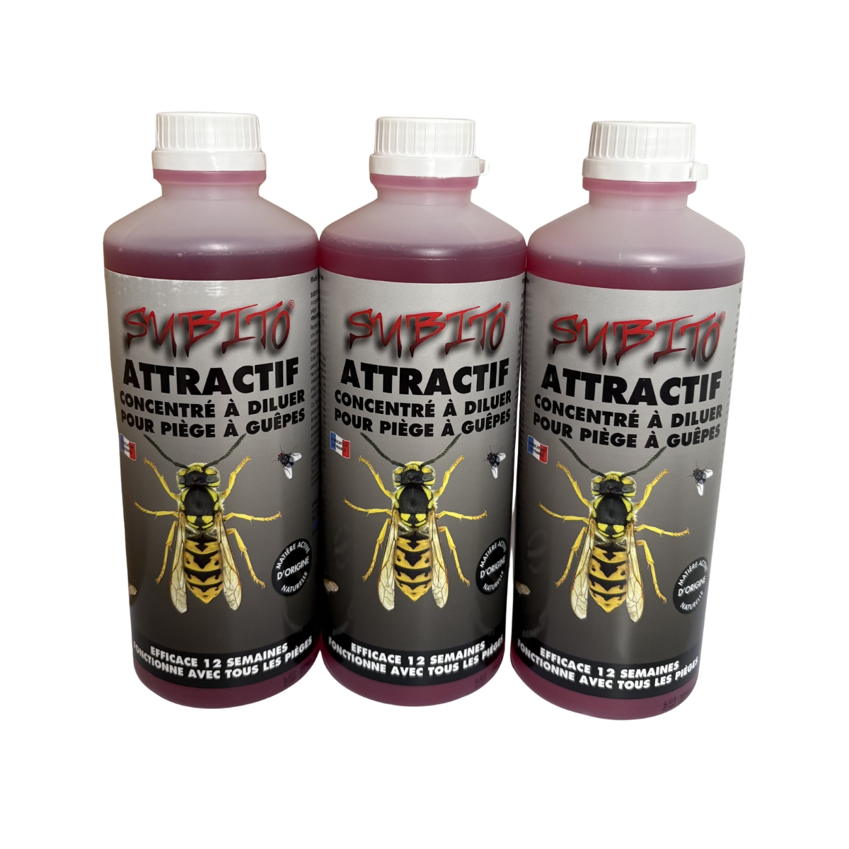 L’Attractif Subito est un liquide concentré à diluer pour tous types de pièges, spécialement formulé pour attirer et piéger guêpes, frelons (y compris frelons asiatiques) et mouches.
