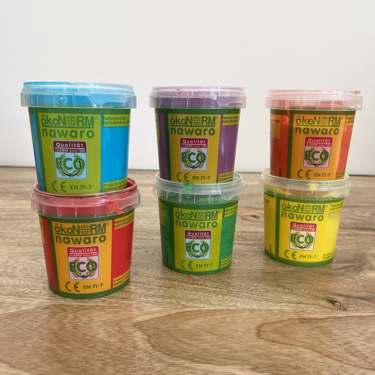 Boite de 6 pots de peinture aux doigts à base de matières naturelles, solubles dans l’eau.