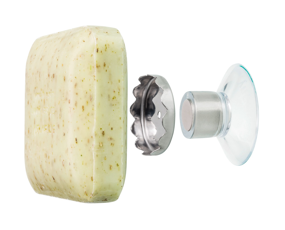 PRATIQUE : cet ensemble se compose d’une base aimantée à ventouse que l’on fixe par pression sur toute surface lisse comme le carrelage, la paroi de douche en verre ou le lavabo en céramique, en pierre, en porcelaine… Et d’une autre partie métallique indépendante, dentée, qu’on enfonce dans le savon. Le savon est ainsi solidement fixé sur sa base quasiment n’importe où.