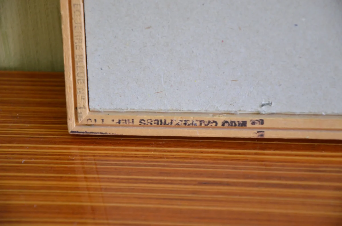 Petit cadre en bois clair, reproduction de paysage signé Michèle Gondinet.