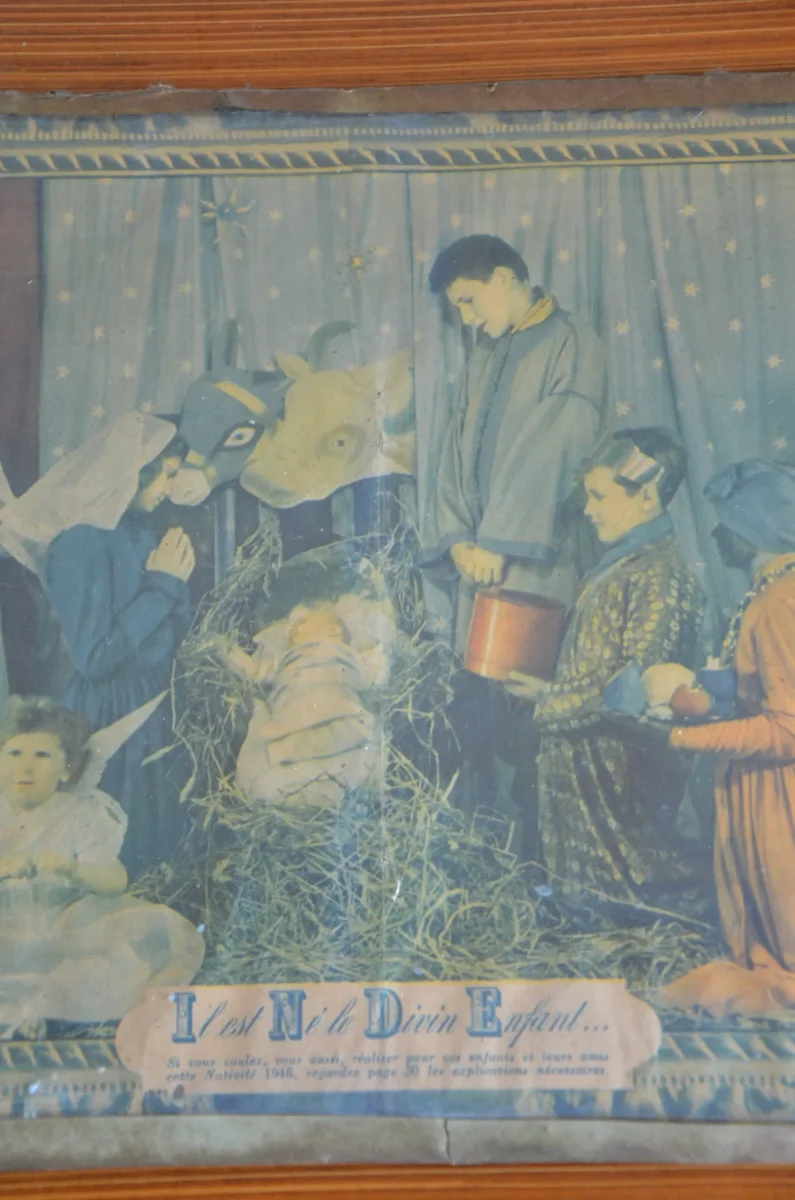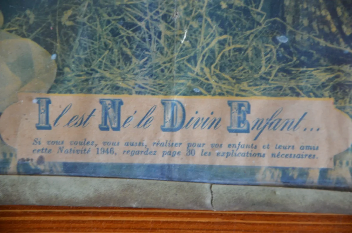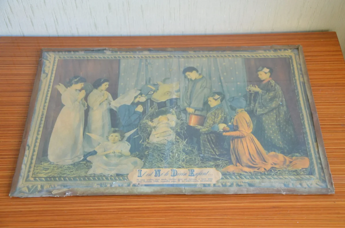 Tableau sous verre « il est né le divin enfant », 1946. « si vous voulez, vous aussi, réalisez pour vos enfants et leurs amis cette nativité 1946, regarder par 30 les explications nécessaires. »